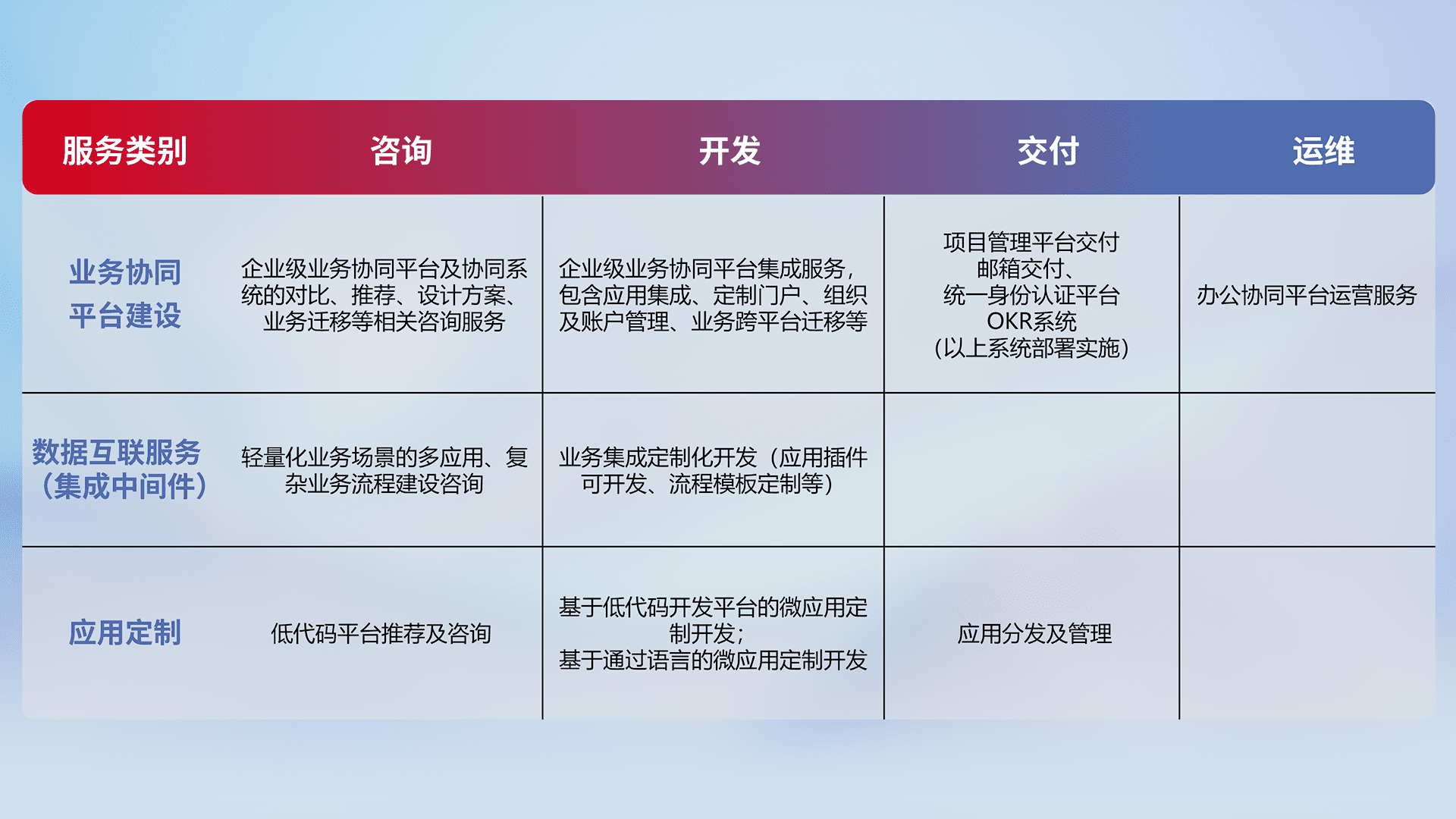 针对钉钉、、、、企微、、IDaas等平台级产品提供产品的规划、、方案、、、交付、、、、定制化开发等服务,,,,实现如统一协同办公、、智能客户服务、、、混合会议管理、、、智能数据查询、、等业务场景,,,实现数字化转型。。。。