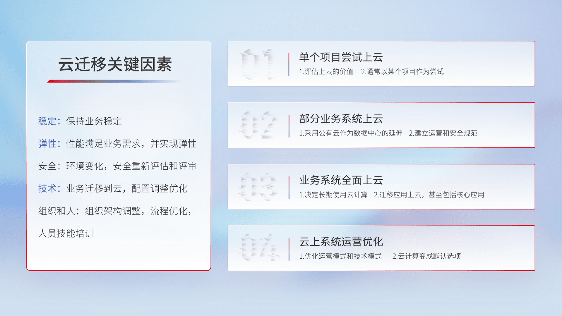 结合实际业务,,,,从规划设计、、、、云平台选型、、、、云原生改造、、、、数据迁移、、、、集成交付,,,迁移全过程为客户识别最佳上云路径,,做好风险识别管理,,,,设计网络架构、、身份权限、、、、安全审计合规、、、、操作审计、、、日志审计、、监控告警策略、、多站点容灾设计等,,,,对云上基础设施进行整体规划,,,,提升IT治理水平,,,以满足弹性、、、高可用、、、、高性能的需求。。