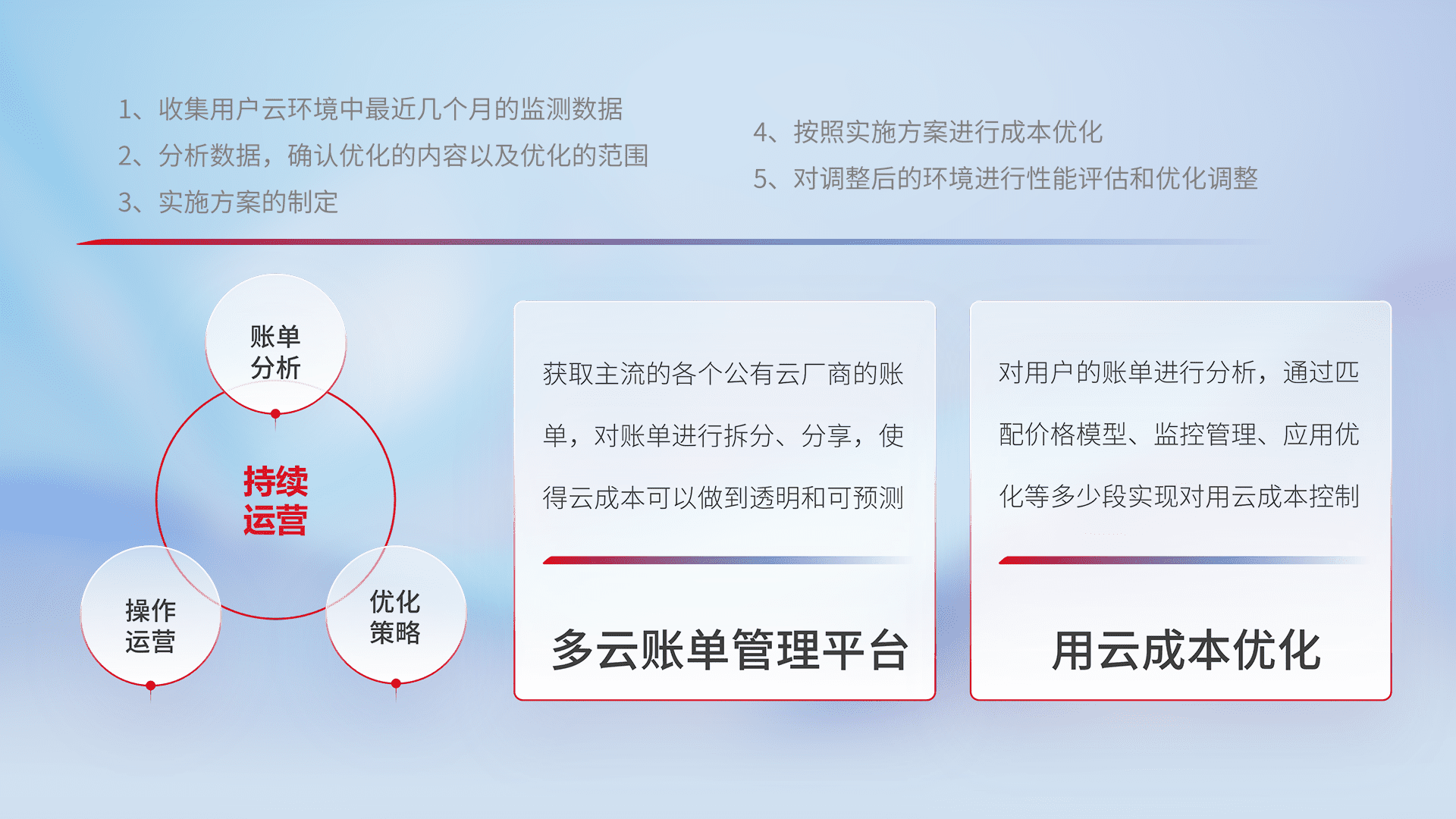 通过多云纳管,,,以统一的资源数据模型把客户的云资源进行抽象和封装,,,,进而实现对多云资源的统一操作,,,,保障云资源管理的可靠性、、稳定性与可用性。。。量身定制化运维内容,,,,配置、、开发运维、、、补丁管理、、、备份、、、、监控、、认证和访问管理、、、、审计和日常巡检等,,保障在用云过程中的可靠度,,稳定度以及高可用率。。。